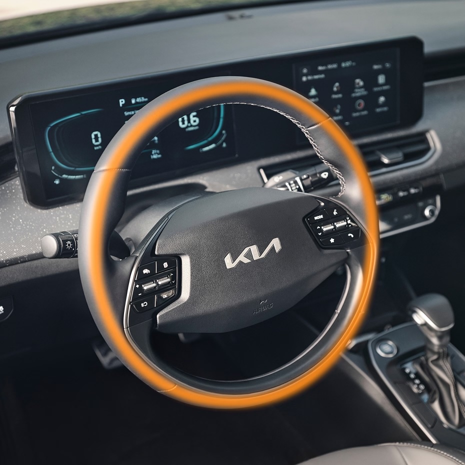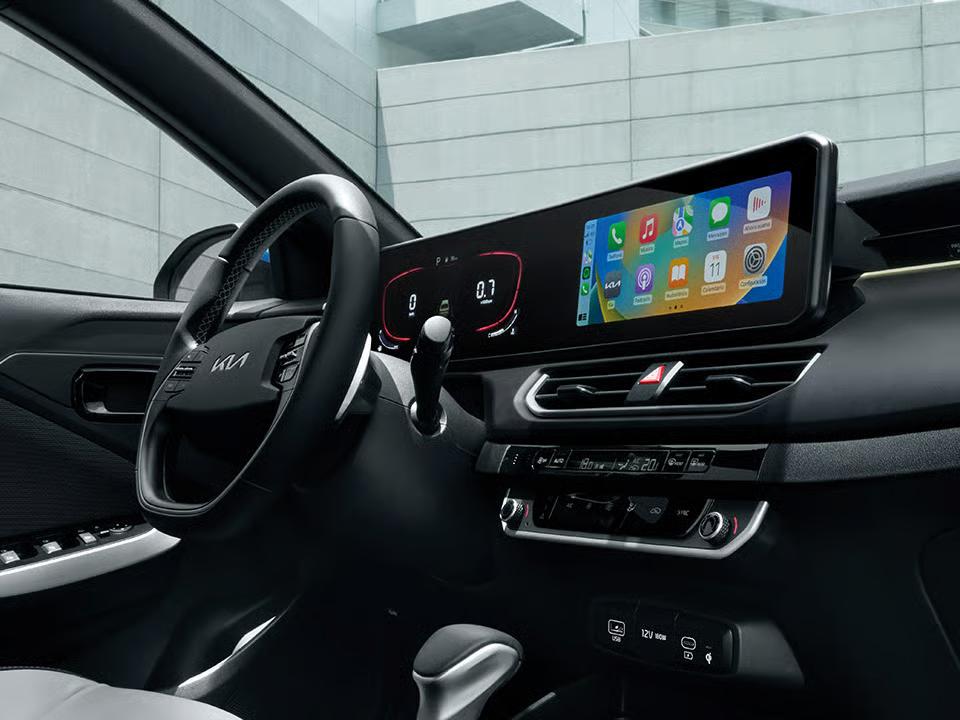 Центральное место в интерьере занимает объединенный под общим стеклом блок из 4,2-дюймовой цифровой приборной панели и 10,25-дюймовой мультимедийной системы. Поддерживается беспроводное подключение Apple CarPlay и Android Auto. Двухспицевое рулевое колесо повторяет дизайн cовременных моделей Kia.